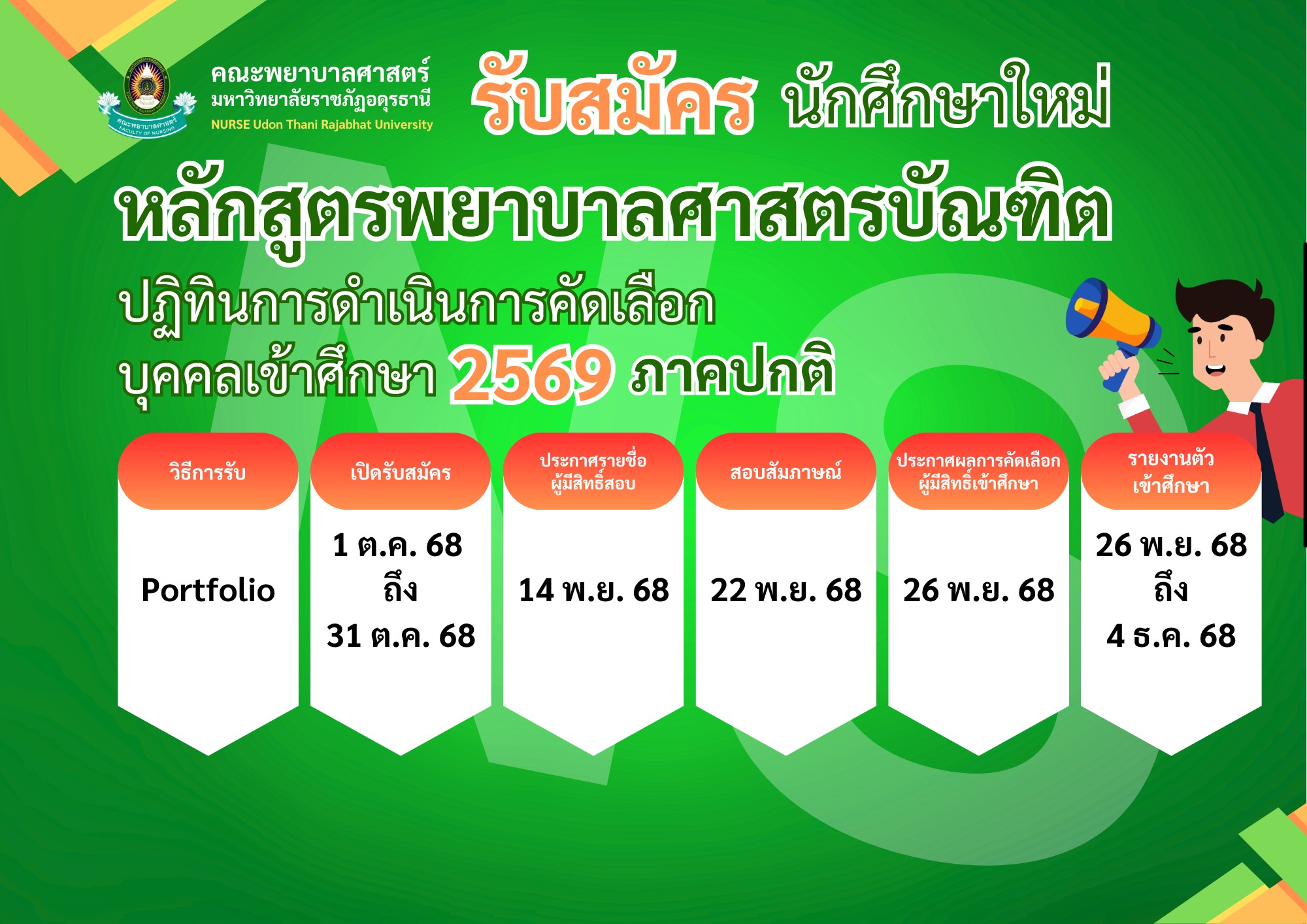- NEW!! ประกาศมหาวิทยาลัยราชภัฏอุดรธานี เรื่อง รับสมัครนักศึกษา หลักสูตรพยาบาลศาสตรบัณฑิต รอบ portfolio ประจำปี 2569