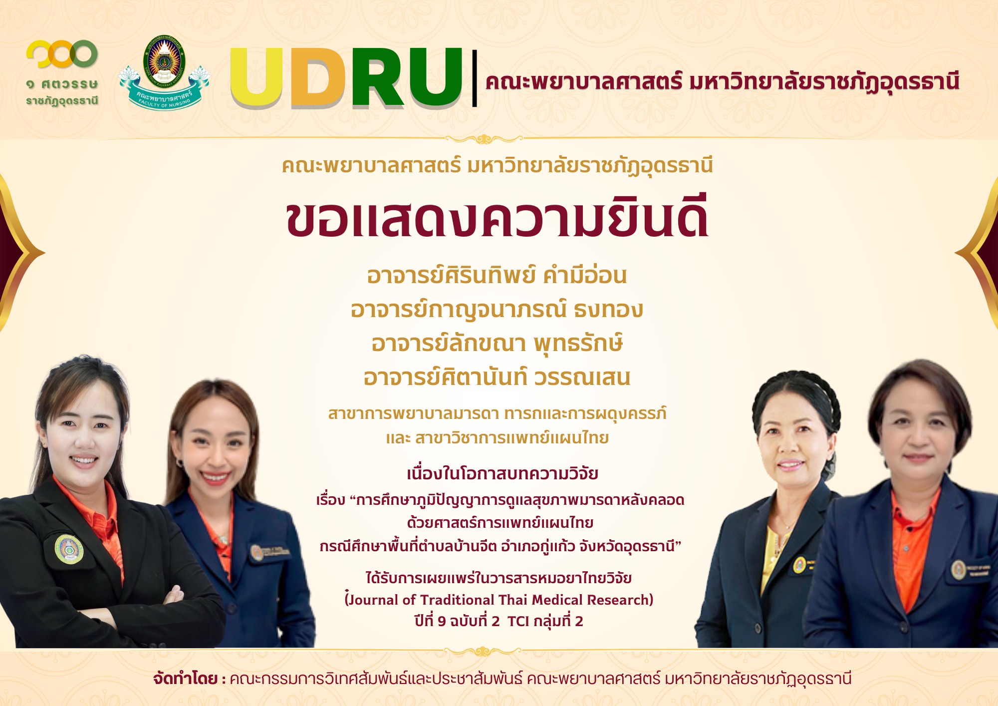 ขอแสดงความยินดีกับ อาจารย์ศิรินทิพย์ คำมีอ่อน คณบดีคณะพยาบาลศาสตร์ อาจารย์กาญจนาภรณ์ ธงทอง อาจารย์สาขาวิชาการแพทย์แผนไทย คณะวิทยาศาสตร์ อาจารย์ลักขณา พุทธรักษ์ และ อาจารย์ศิตานันท์ วรรณเสน อาจารย์สาขาการพยาบาลมารดา ทารก และการผดุงครรภ์ เนื่องในโอกาสบทความวิจัย