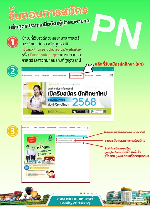 ขั้นตอนรับสมัครนักศึกษา (PN) คณะพยาบาลศาสตร์ มหาวิทยาลัยราชภัฏอุดรธานี เปิดรับสมัครนักศึกษาใหม่ ภาคปกติ หลักสูตรประกาศนียบัตรผู้ช่วยพยาบาล รุ่นที่ 1 ประจำปีการศึกษา 2567