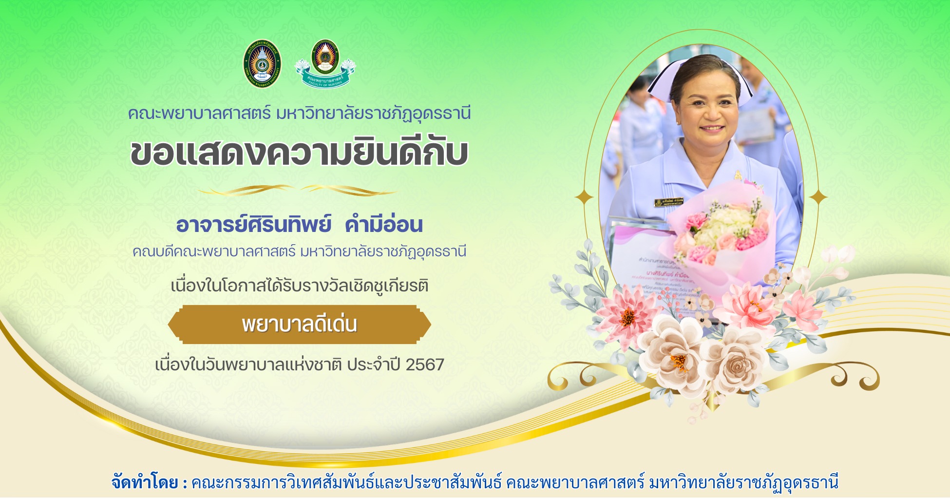 อแสดงความยินดีเป็นอย่างยิ่งกับ อาจารย์ศิรินทิพย์ คำมีอ่อน คณบดีคณะพยาบาลศาสตร์ เนื่องในโอกาสได้รับคัดเลือกให้เป็นพยาบาลที่มีคุณธรรม จริยธรรม ดีเด่นระดับจังหวัด วันพยาบาลแห่งชาติ