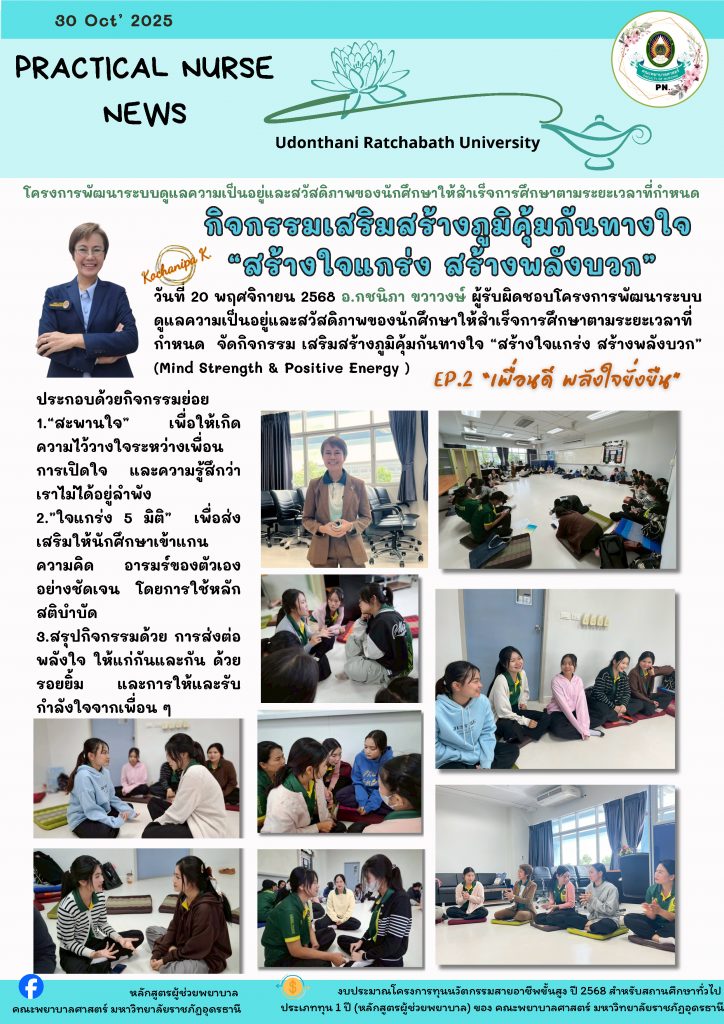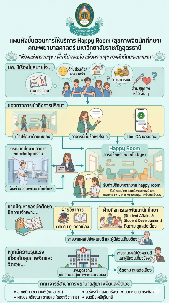 คณะพยาบาลศาสตร์ ได้จัดให้มีอาจารย์ประจำชั้น อาจารย์ที่ปรึกษาให้กับนักศึกษาทุกคน เพื่อแนะแนวการศึกษา การปรับตัวระหว่างเรียนภายในคณะฯ และตลอดจนการดำเนินชีวิต เมื่อนักศึกษามีปัญหา เครียด ทุกข์ใจ ไม่สบายใจ สามารถรับบริการขอคำปรึกษาได้ และคณะฯ มีคณาจารย์จากสาขาการพยาบาลสุขภาพจิตและจิตเวช ที่มีความรู้ความสามารถที่จะให้การปรึกษาและดูแลสุขภาพใจของนักศึกษา