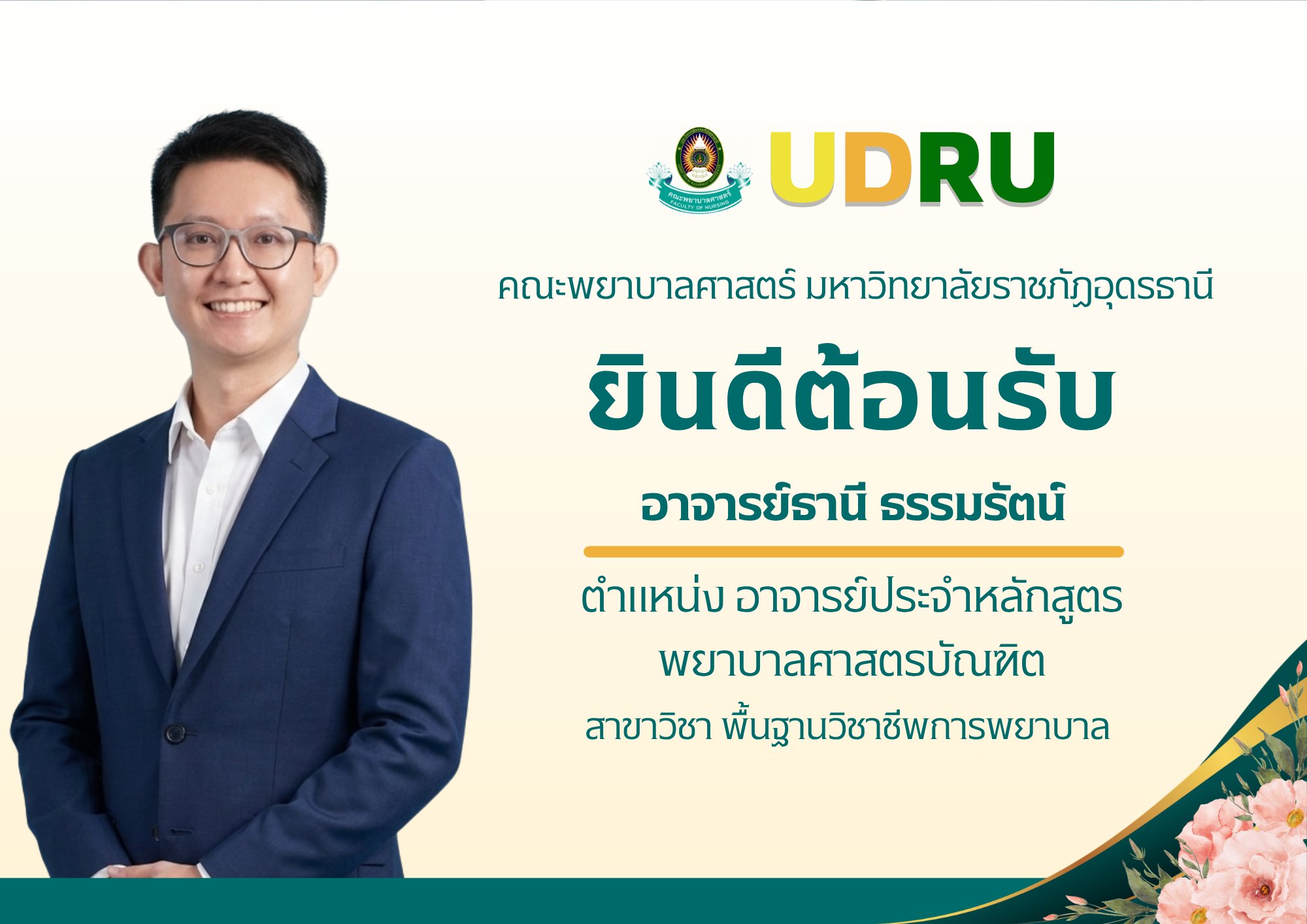 #ยินดีต้อนรับอาจารย์ใหม่#พื้นฐานวิชาชีพการพยาบาล ข่าวประชาสัมพันธ์คณะพยาบาลศาสตร์ มหาวิทยาลัยราชภัฏอุดรธานี คณะพยาบาลศาสตร์ มหาวิทยาลัยราชภัฏอุดรธานี ขอแสดงความยินดีและยินดีต้อนรับอาจารย์ธานี ธรรมรัตน์ในโอกาสเข้ารับตำแหน่ง อาจารย์ประจำหลักสูตรพยาบาลศาสตรบัณฑิตสาขาวิชา พื้นฐานวิชาชีพการพยาบาลการเข้าร่วมเป็นส่วนหนึ่งของคณาจารย์ในครั้งนี้ นับเป็นพลังสำคัญในการร่วมพัฒนาการจัดการเรียนการสอน การวิจัย และการบริการวิชาการ เพื่อเสริมสร้างคุณภาพบัณฑิตพยาบาลให้มีความรู้ ความสามารถ และมีคุณธรรมจริยธรรมตามมาตรฐานวิชาชีพ พร้อมตอบสนองต่อความต้องการของระบบสุขภาพและสังคมในอนาคต คณะพยาบาลศาสตร์ มหาวิทยาลัยราชภัฏอุดรธานี ขอแสดงความยินดีและยินดีต้อนรับสู่ครอบครัวพยาบาลศาสตร์ UDRU อย่างอบอุ่นคณะพยาบาลศาสตร์ มหาวิทยาลัยราชภัฏอุดรธานี ขออนุญาตเผยแพร่ภาพ และข่าวประชาสัมพันธ์ภาพบุคคลที่มีในกิจกรรม#UDRUPR#ประชาสัมพันธ์ราชภัฏอุดร#พยาบาลศาสตร์ราชภัฏอุดร#พยาบาลศาสตร์#FONUDRU#NurseUDRU#NursingUDRU#UDRU#พยาบาลศาสตร์#คณะพยาบาลศาสตร์#มหาวิทยาลัยราชภัฏอุดร ดูน้อยลง Views: 0