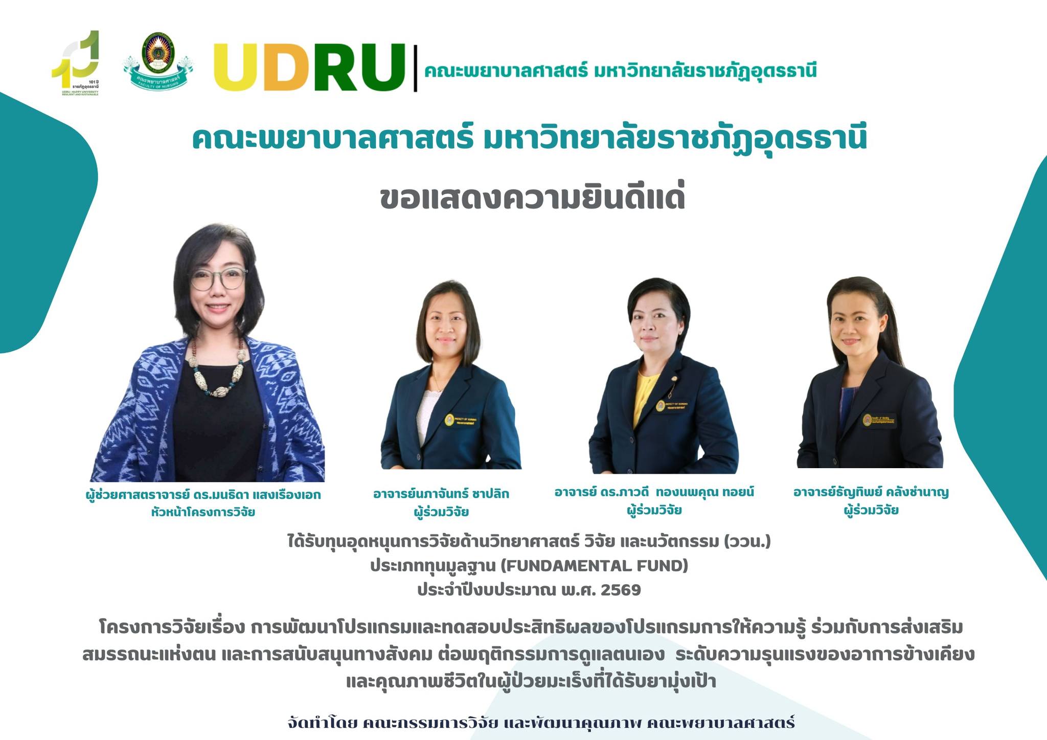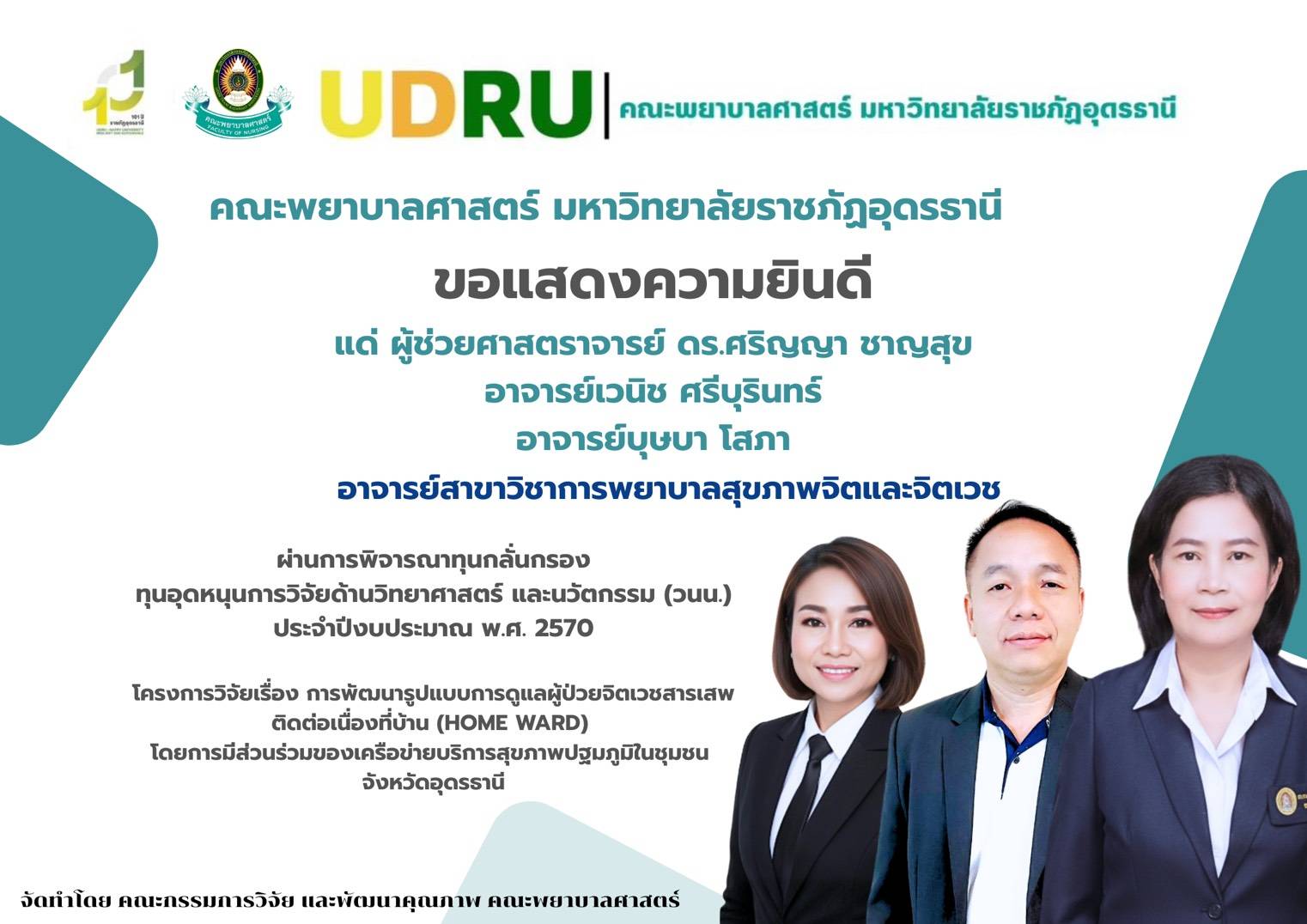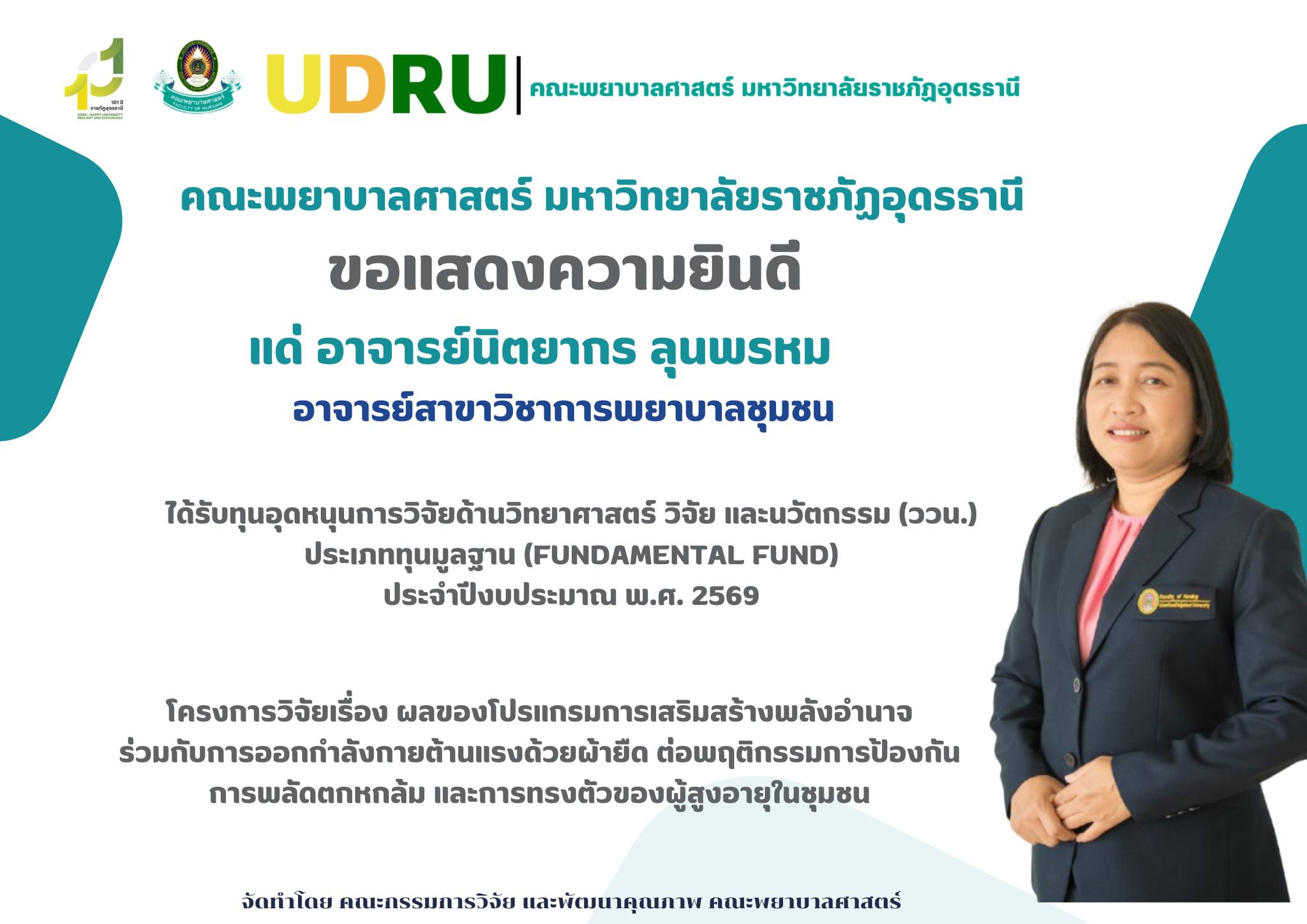 ขอแสดงความยินดี แด่ อาจารย์นิตยากร ลุนพรหม อาจารย์ สาขาวิชาการพยาบาลชุมชน ในโอกาสได้รับทุนวิจัยด้านวิทยาศาสตร์ วิจัย และนวัตกรรม (ววน.)